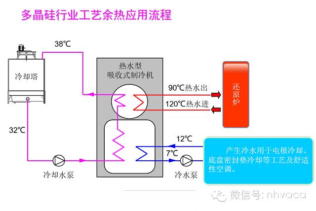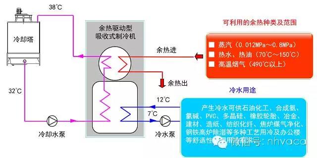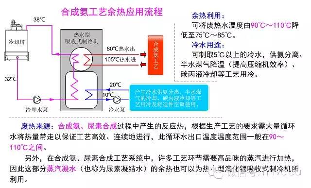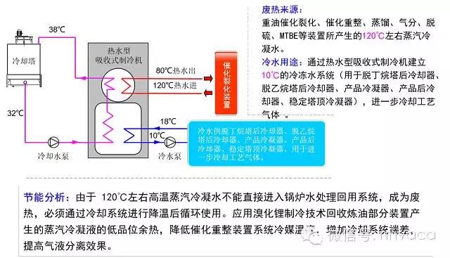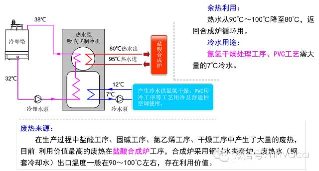 废热来源:在整个生产工艺中有高压变低压的的过程中有热量放出,产生0.06公斤112℃的蒸汽供机组使用。每小时制出200吨冷水用于光气的冷却。 如不使用吸收式制冷机需用电制冷机组制冷水冷却光气。采用吸收式制冷机替代了电制冷。冷水用途:制出冷水用于光气的冷却。