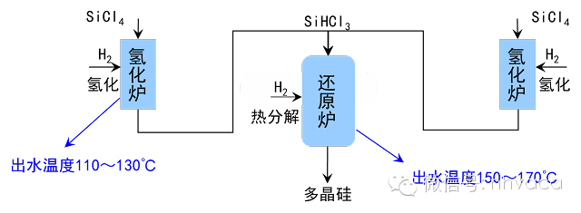 废热来源:还原炉和氢化炉是多晶硅的主要生产工艺,会产生大量的余热,还原炉、氢化炉采用钢制水夹套炉。还原炉产生的热水(钢套冷却水)出口温度一般在150~170℃左右,主要用于闪发成蒸汽供精馏塔釜加热用。氢化炉产生的热水(钢套冷却水)出口温度一般在110~130℃左右,存在利用价值。